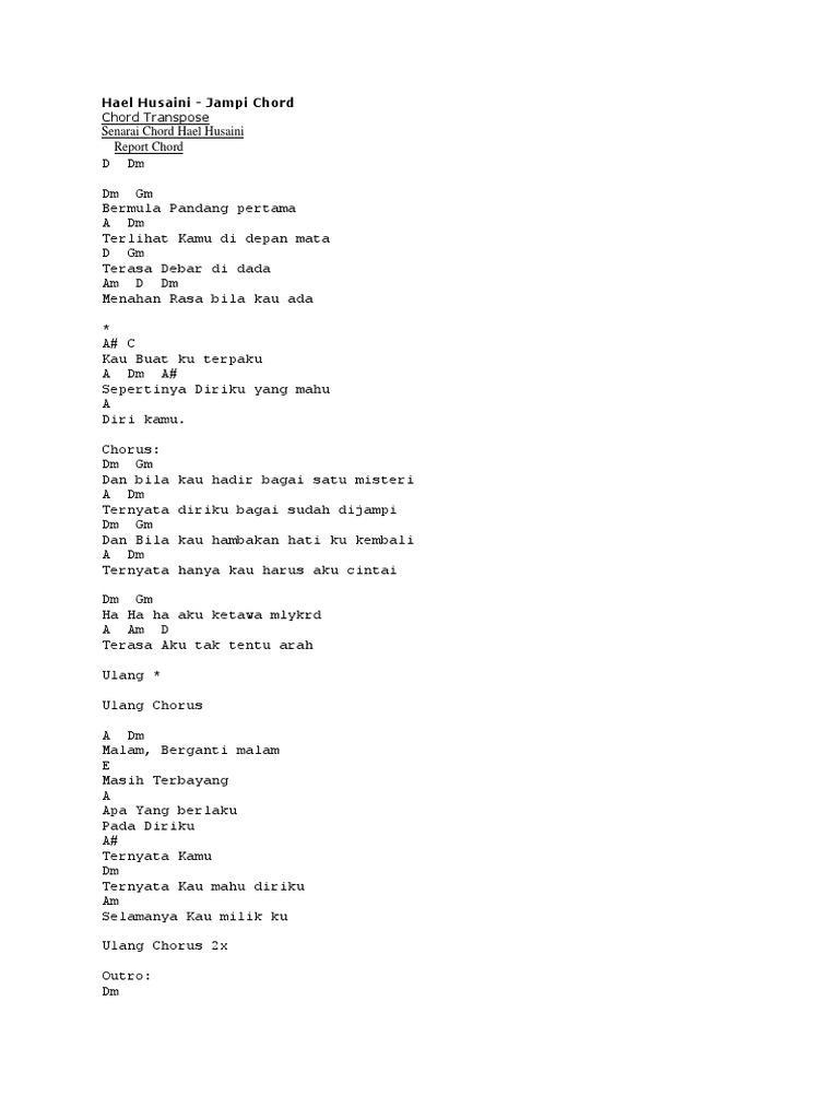 Hael Husaini - Jampi Chord. Lirik Lagu Malaysia Lirik Lagu Sepanjang Zaman Hubungi. Dm Gm Bermula pandang pertama A Dm Terlihat kamu di depan mata Dm Gm Terasa debar di dada A Dm Menahan rasa bila kau ada A C Kau buat ku terpaku A Dm C A Sepertinya diriku yang mahu A Diri kamu Chorus.